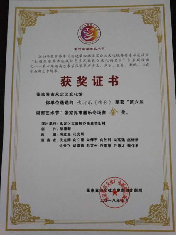 近日,在湖南最高水平的综合性艺术活动——第六届湖南艺术节作品类“三湘群星奖”获奖名单中惊喜地发现,农工党张家界市委党员、民间艺术家赵绪鑫参演的作品《糊仓》喜获音乐类金奖。