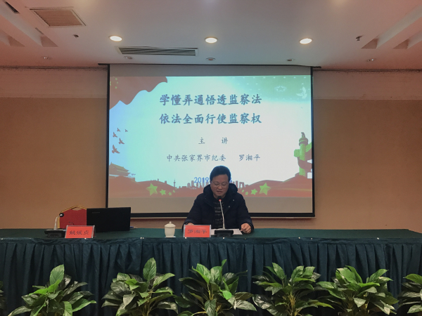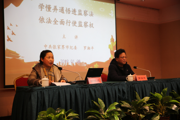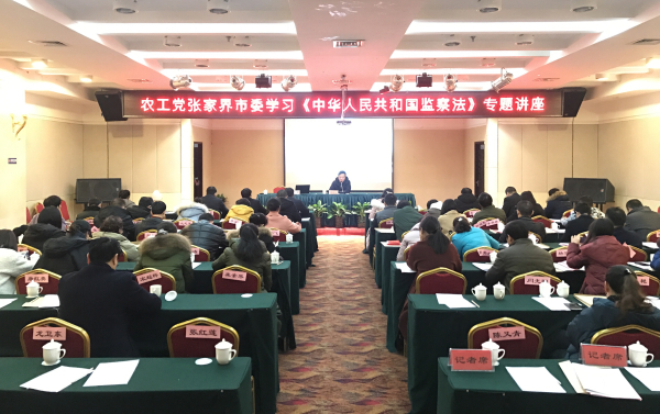 1月8日,农工党张家界市委组织党员专题学习《中华人民共和国监察法》,中共张家界市纪委常委、市监察委委员罗湘平同志作了题为《学懂弄通悟透监察法依法全面行使监察权》专题解读,张家界市政协副主席、农工党张家界市委主委覃仕斌、农工党市委班子成员和党员60多人参加学习,农工党市委副主委、市监督委员会主任姚媛贞主持学习讲座。