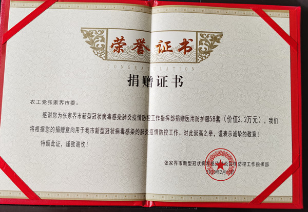 得知张家界市急迫需要医用防护服后,农工党市委发动党员寻找货源,很快得到了农工党长沙市委党员、湖南普瑞康医药有限公司董事长李光焰的帮助,筹措到了58套医用防护服并迅速寄往张家界,从党费上交、寻找货源到捐赠交接,前后仅用5天时间。农工党市委捐赠的防护服得到疫情防控工作指挥部物资验收人员的高度肯定,称“专家团队”采购的高质量物资。