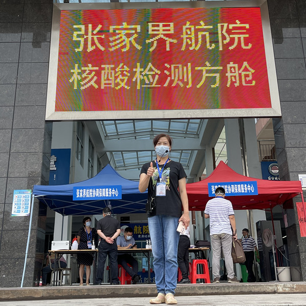 8月2日,梁英一来到航院方舱核酸检测基地,即投入到火热的工作中。张家界航院方舱核酸检测基地共有方舱16台,专业技术人员346名,其中省卫健委派驻援助工作人员37名(院感2人),市卫健委派驻工作人员8人(院感5人),第三方公司301人,另有航院后勤服务、电力保障等工作人员约150人。航院方舱核酸检测基地是实现张家界全员核酸检测,快速发现病例,控制疫情的关键核心设施,其日最大检测能力可达17万管/达。从8月2日到7日只有梁英和省感控专家周鹏程两个人,因为周鹏程同时又负责全市其它医院的检查指导,因此大部分时间只有梁英一个人坚持在方舱基地,24小时值守。8月7日市卫健委从民营医院抽调了一个93年出生小姑娘,梁英负责带教培训,然后上岗。12日市卫健委从民营医院又抽派一小姑娘补充力量,这时梁英组,有了三人,24小时可以轮值蹲守,梁英肩上的担子才略微轻松了一点。