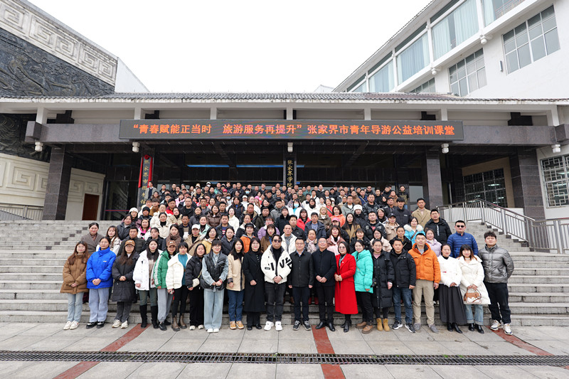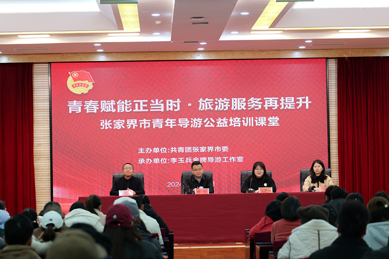 2月28日,由共青团张家界市委主办、李玉兵金牌导游工作室承办的“青春赋能正当时 ,旅游服务再提升”张家界市青年导游公益培训课堂在张家界学院开班,全市200多名青年导游参加培训。