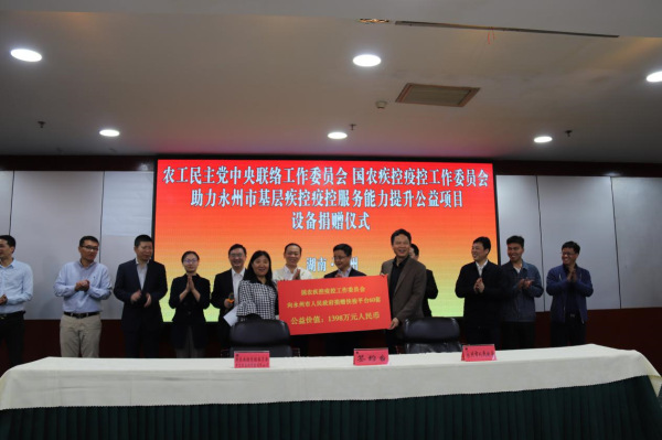 2019年5月10日上午,农工党中央联络工作委员会与国农疾控疫控工作委员会在南华大酒店举行“助力永州基层疾控疫控服务能力提升公益项目设备捐赠仪式”。捐赠仪式上,永州市人民政府与国农疾控疫控工作委员会现场签署捐赠帮扶协议,由爱心企业卡尤迪生物科技(北京)有限公司向我市捐赠非洲猪瘟分子检测设备60套,公益价值1398万元。农工党中央联络工作委员会委员、中国初级卫生保健基金会理事、国农智库院长谢向英,国农疾控疫控工作委员会成员,爱心企业卡尤迪生物科技(北京)有限公司代表参加捐赠仪式;市政协副主席、市卫健委主任、农工党永州市委会主委欧阳德群出席活动。