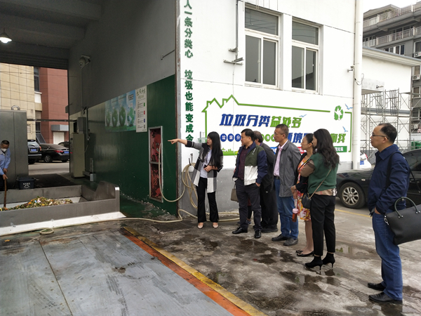 在常熟市城市管理局副局长徐建东的带领下,调研组首先来到常熟垃圾分类市示范小区之一的瑞仕花园四类分类收集点,仔细查看垃圾分类硬件设施和干、湿、可回收、有害垃圾分类流程,详细了解小区人员配备、服务引导、奖惩机制、宣传教育等多方面情况。紧接着,调研组来到莫城街道,考察有机垃圾资源化处置站点,实地观看餐厨垃圾终端处置的各个环节,详细了解工艺流程和处置能力。该处负责收集处理附近行政村的餐余垃圾,并将其制成有机肥重新投入农业耕作。