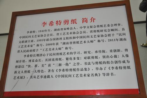 8月24日,湖南省“工艺美术大师”李希特剪纸艺术展在湖南省图书馆拉开帷幕,在为期5天的展览活动中,将展出李希特从事剪纸艺术生涯50年来的优秀作品120幅。本次活动由娄底市人民政府、省工艺美术协会、省图书馆、省美术家协会、省非物质文化遗产保护中心主办,由双峰县人民政府、省民间文艺家协会、省工艺美术剪纸专业委员会承办。湖南省、娄底市、双峰县各级领导和艺术界、新闻界人士出席开幕式。农工党湖南省委原专职主委戴君惕,省委参政议政处处长张基华、副调研员杨静华,组织处处长李湘祁等人参观了艺术展。