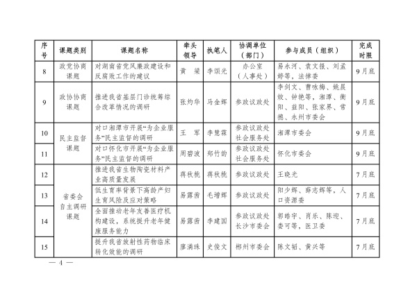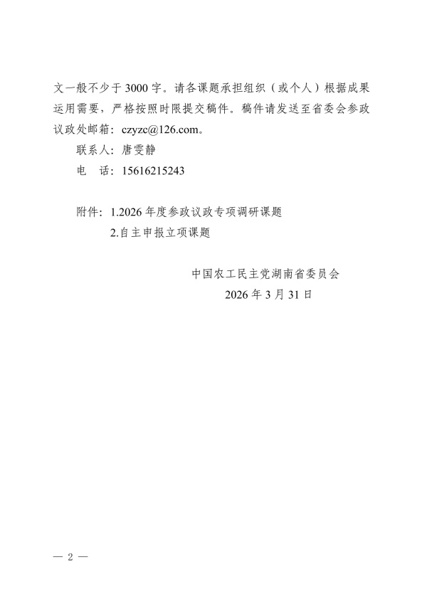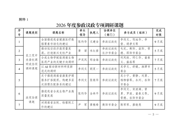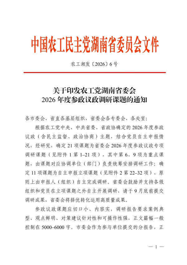 关于印发农工党湖南省委会2026年度参政议政调研课题的通知