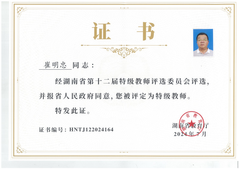 2024年,农工党常德市文教支部党员、市七中督导室主任崔明忠老师一年之内完成了两件大事:5月获评“湖南省特级教师”,12月获评“湖南省正高级教师”。在此之前,2017年获评“湖南省优秀教师”。至此,崔明忠老师便将教育界含金量高的三项荣誉集于一身。再往前追溯,崔老师2006年获得副高职称、获评“常德市优秀教师”。